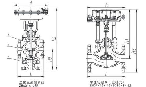 切斷閥采用多彈簧執(zhí)行機構(gòu)與調(diào)節(jié)機構(gòu)用三根立柱相連,整個高度可減小約30%,重量可減輕約30%。